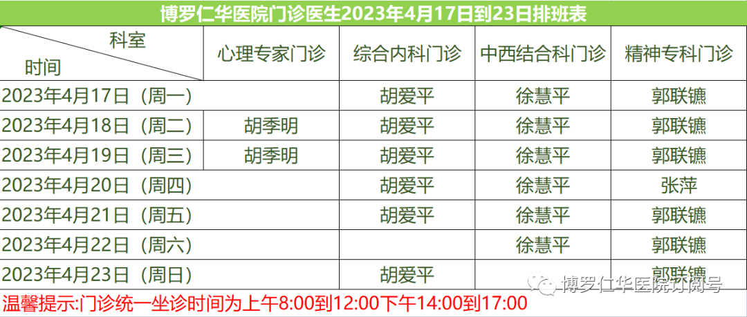 门诊医生2023年4月17日到23排班表
